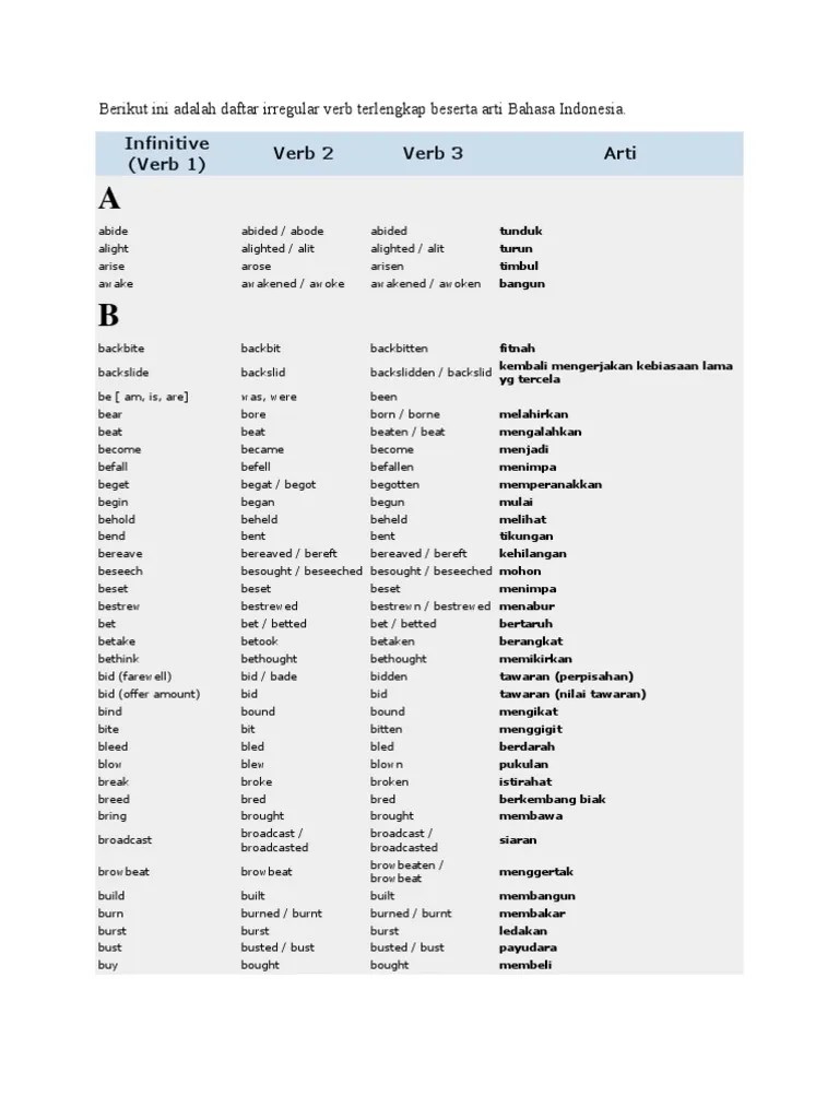 Berikut ini merupakan daftar kata kerja irregular dalam bahasa inggris sesuai abjad. Aplikasi ini berisi kumpulan verb 1 verb 2 verb 3 dari regular and . Dalam bahasa inggris, kita mengenal time frame atau jangka waktu. Infinitive (verb 1), past simple (verb 2), past participle (verb 3) . Dalam bahasa inggris memang ada kata kerja yang merupakan bentuk pertama, kedua dan ketiga, yang sering dikenal dengan istilah verb 1, .